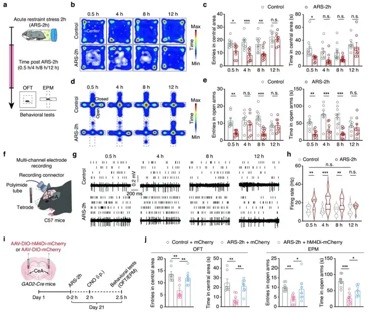 急性束缚2小时(ARS-2h)是常用的小鼠焦虑样行为的模型。ARS-2h小鼠在应激后0.5 h、4 h和8 h,小鼠表现出焦虑样行为,而在应激后12 h消失。CeA在焦虑状态的产生中起关键作用。然后,作者通过在体多通道记录发现小鼠在应激后0.5 h/4 h/8 h,GABACeA神经元活性增加,在应激后12 h恢复到与对照组相当的水平,与行为测试的结果很好的吻合。化学遗传学抑制GABACeA神经元缓解了应激后小鼠的焦虑样行为。这些结果表明,应激可增加小鼠GABACeA神经元活性,并诱导焦虑样行为,而这种神经元活性的降低伴随着焦虑样行为的消失。