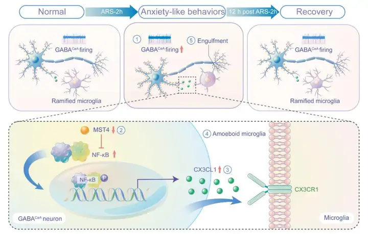 2024年1月10日,中国科学技术大学张智/曹鹏/晋艳教授团队在Nature Communications上发表了名为“Microglia govern the extinction of acute stress-induced anxiety-like behaviors in male mice”的研究论文。该研究综合运用了在体多通道记录、三维重构技术和化学遗传学等,发现急性束缚应激导致小鼠中央杏仁核CeA中GABACeA能神经元的活性增加,导致12 h内的焦虑样行为;同时,通过MST4-NF-κB-CX3CL1信号增加GABACeA神经元CX3CL1分泌,从而激活CeA中的小胶质细胞。活化的小胶质细胞反过来通过吞噬GABACeA神经元树突棘来抑制其活性,最终导致由束缚应激诱导的焦虑样行为的消失。中国科学技术大学生医部博士后陈丹阳、博士生娄倩倩和已毕业博士生宋相杰为本文的共同第一作者。中国科学技术大学生医部张智教授、曹鹏博士后和晋艳副教授为本文的共同通讯作者。本研究得到科技部、国家自然科学基金、省科技重大专项计划、安徽省自然科学基金、博新计划等项目的资助,以及中国科学技术大学生命科学核心设施中心的帮助。