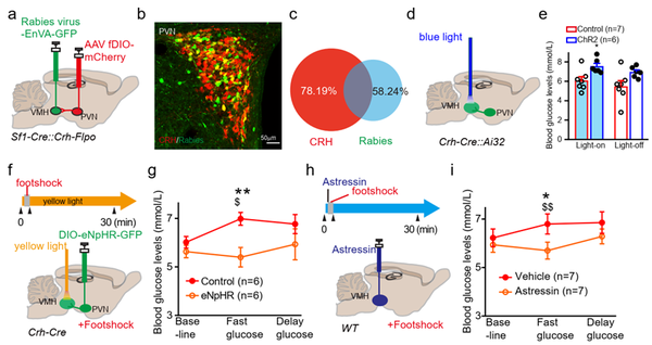 接着作者通过病毒示踪、光遗传学、药理学等技术证明了PVNCRH-下丘脑腹内侧核(VMH)环路对急性应激时葡萄糖快速释放的必要性(图2)。