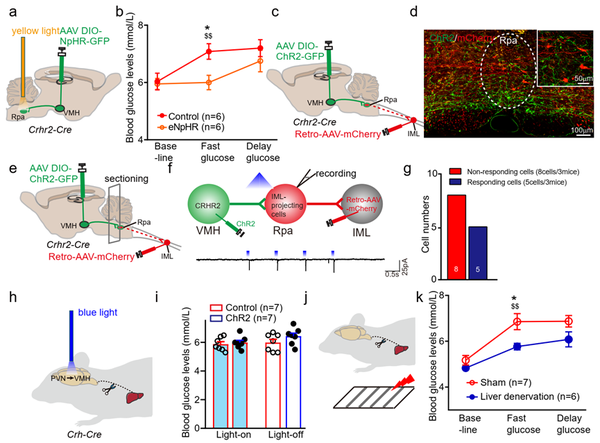 图4. VMH的CRH信号通过RPa→IML(中间外侧核)→交感神经→肝脏途径调节葡萄糖代谢