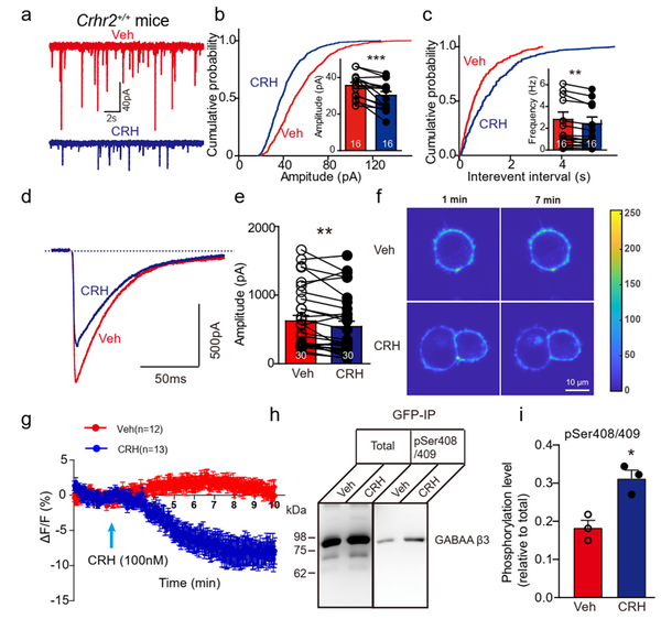 图3. VMH中CRH信号通过抑制GABAA受体β3亚基的膜转运抑制突触后抑制性传递
