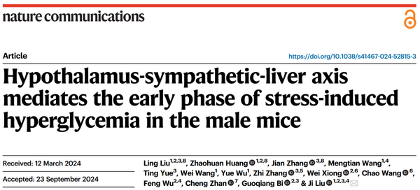 2024年10月5日,中国科学技术大学刘际研究员团队在Nature Communications上发表题为“Hypothalamus-sympathetic-liver axis mediates the early phase of stress-induced hyperglycemia in the male mice ”的研究论文。该研究发现应激血糖释放至少可分为两个阶段:第一个快速阶段是由下丘脑(室旁核到下丘脑腹内侧核)-交感神经(中缝苍白核到中外侧核)-肝(HSL)轴活动介导的;第二个延迟阶段是由肾上腺活动介导的。阻断HSL轴的活性会削弱捕食诱发的逃跑反应,表明HSL通路的活性是应对应激所必需的。该研究为理解应激与能量平衡的复杂相互作用关系提供新的理论基础,有助于更全面的理解中枢在调控机体葡萄糖稳态中的重要作用。