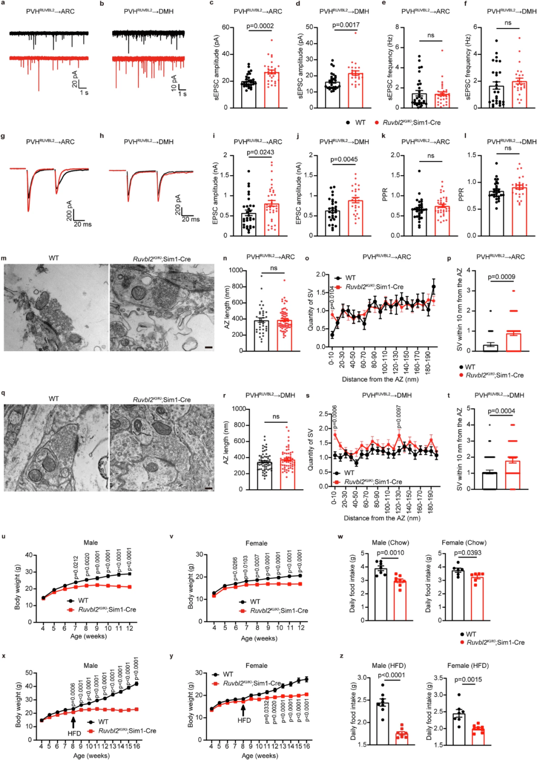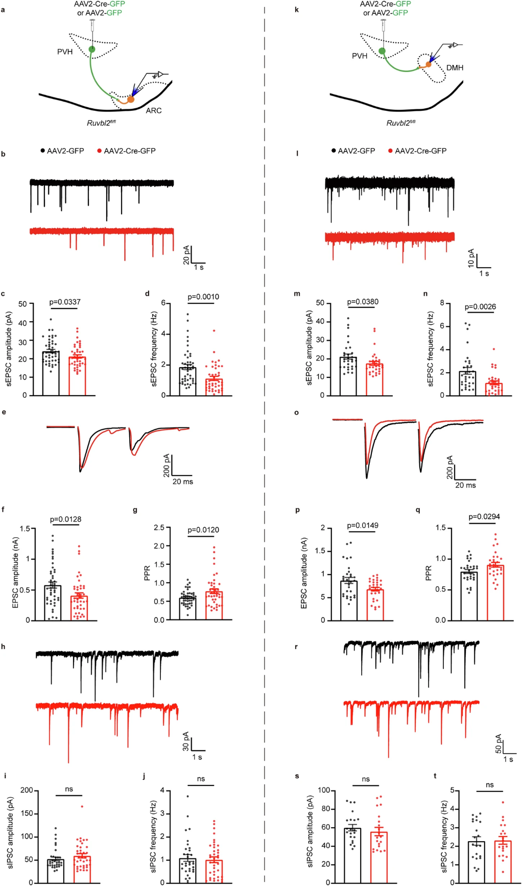 接下来,研究人员为了研究PVH的RUVBL2蛋白以及RUVBL2神经元抑制食欲的细胞机制。利用电生理方法,发现敲除PVH的Ruvbl2会损害神经元兴奋性突触传递而不影响抑制性突触传递。