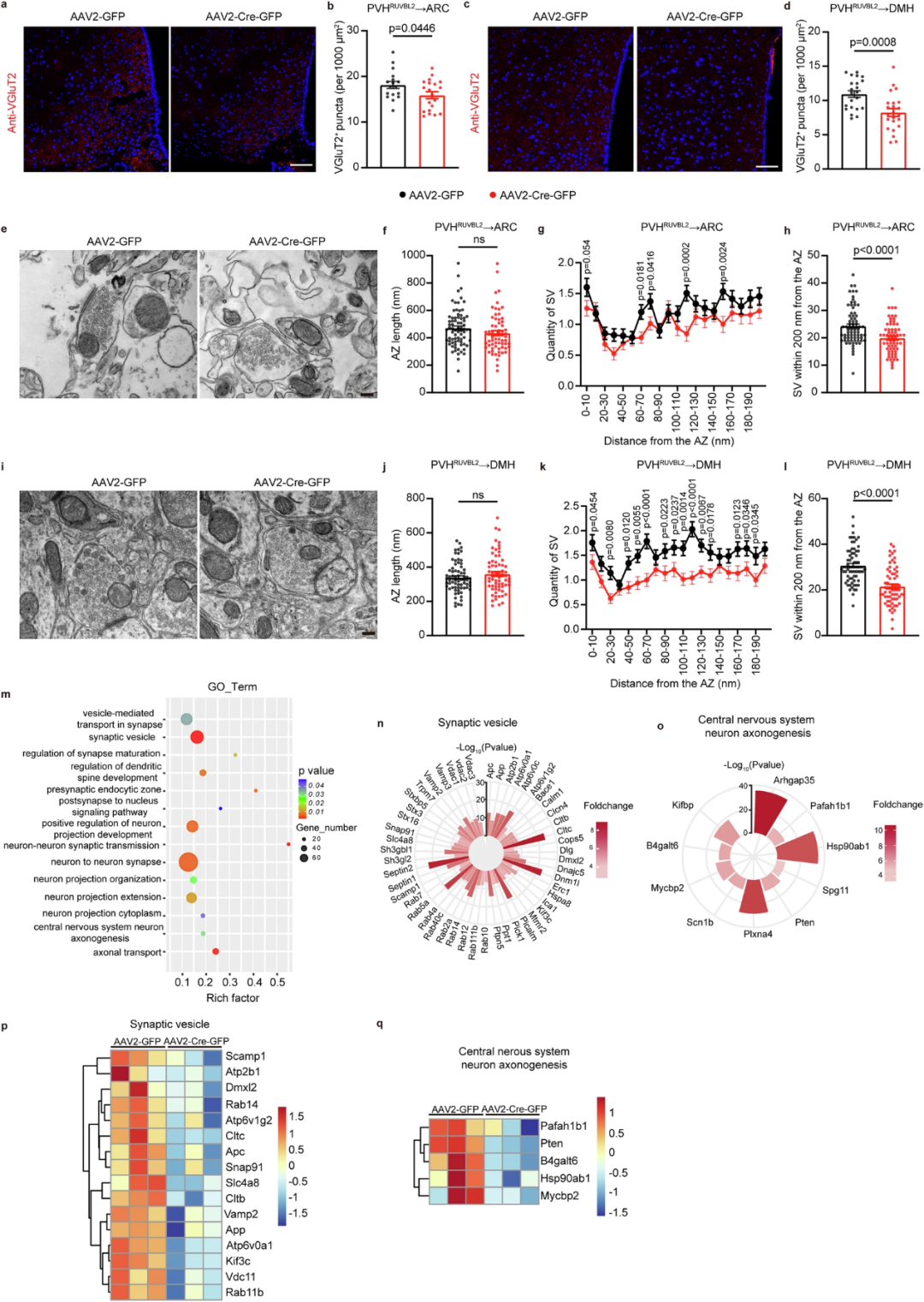 突触传递受损可能是由两种原因导致,一方面是突触前输入受损,另一方面则是囊泡分布不均导致的。为了确定突触传递受损的具体成因,研究人员通过免疫组化方法,发现敲除PVH的Ruvbl2会减少ARC和DMH神经末梢中VGluT2斑点。而利用电镜技术,研究人员发现敲除PVH的Ruvbl2显著减少突触囊泡数量。随后,研究人员利用ChIP-Seq(染色质免疫沉淀测序)联合RNA-Seq(RNA测序)分析,证实RUVBL2参与调控与神经元轴突形成和突触囊泡相关基因的表达。