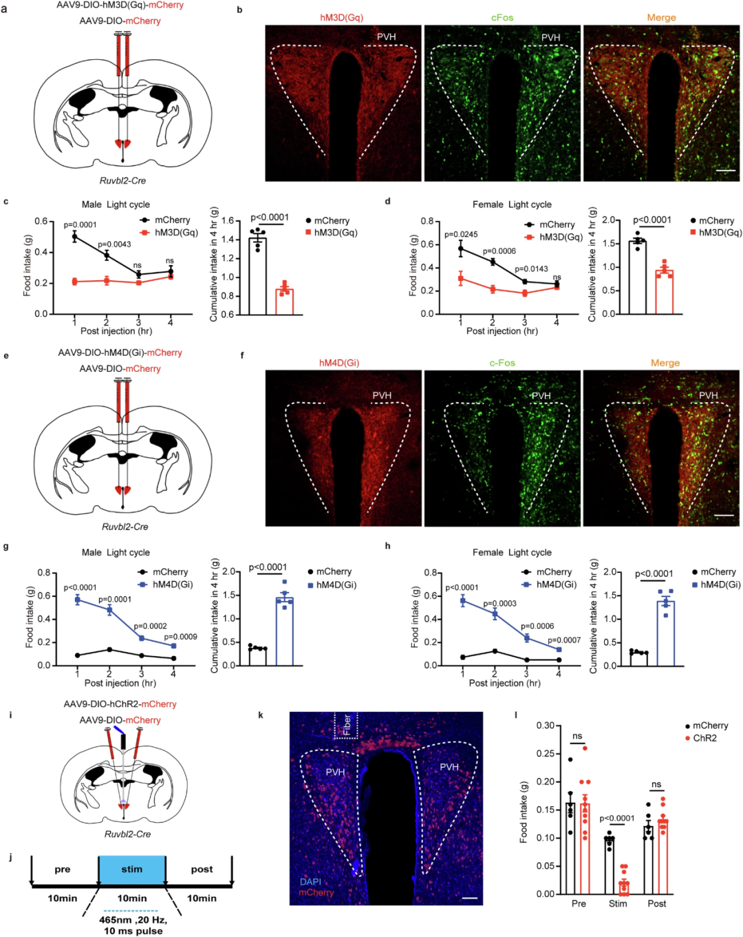 为了探究PVH的RUVBL2神经元(PVHRUVBL2)在调节食欲中的作用,研究人员利用化学遗传学和光遗传学来操纵PVH的RUVBL2神经元活性。研究表明,激活PVHRUVBL2会抑制食欲,而抑制PVHRUVBL2会增加食欲。
