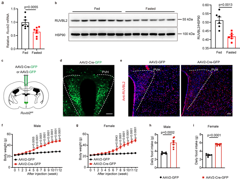 RUVBL2是一种高度保守的AAA+ATP酶(与多种细胞活动相关的ATP酶),已被证明可参与多种细胞过程,在机体内广泛表达。研究人员发现过夜饥饿会导致小鼠PVH的RUVBL2的mRNA和蛋白表达水平下降,这表明PVH的RUVBL2可以感应能量稳态。随后,构建Ruvbl2fl/fl小鼠模型,利用病毒注射特异性敲除PVH中的Ruvbl2。研究人员发现敲除PVH中的Ruvbl2会诱导小鼠过度摄食而导致肥胖。