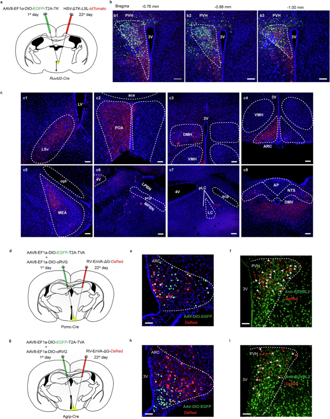 图3. PVH的RUVBL2神经元投射到多个下游脑区