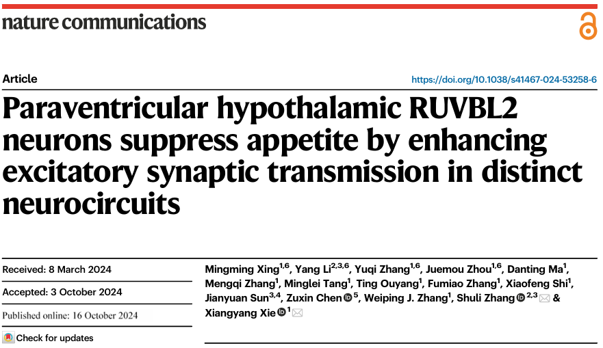 2024年10月16日,天津医科大学朱宪彝纪念医院内分泌研究所谢向阳教授和中国科学院生物物理所张树利副研究员合作在Nature Communications期刊上在线发表题为“Paraventricular hypothalamic RUVBL2 neurons suppress appetite by enhancing excitatory synaptic transmission in distinct neurocircuits”的研究论文。该研究利用病毒注射、化学遗传学、光遗传学、电生理等方法,揭示PVH调节食欲的两条新型神经环路,并阐明PVHRUVBL2通过增强这两条环路的兴奋性突触传递而抑制食欲。