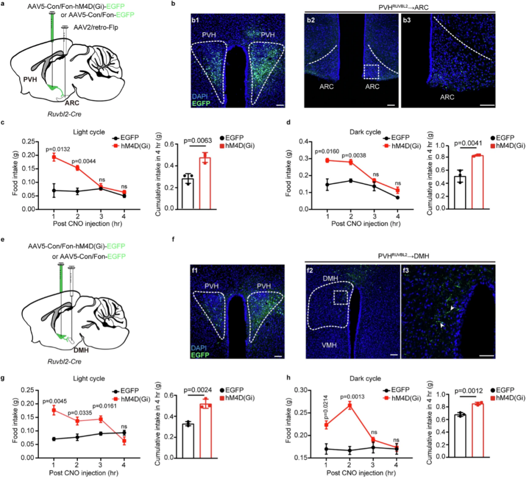 为了确定哪些PVH的RUVBL2神经元的神经环路可以调节食欲,研究人员利用环路特异的化学遗传学发现,PVH的RUVBL2神经元通过投射到ARC、DMH和PB脑区发挥食欲抑制作用。