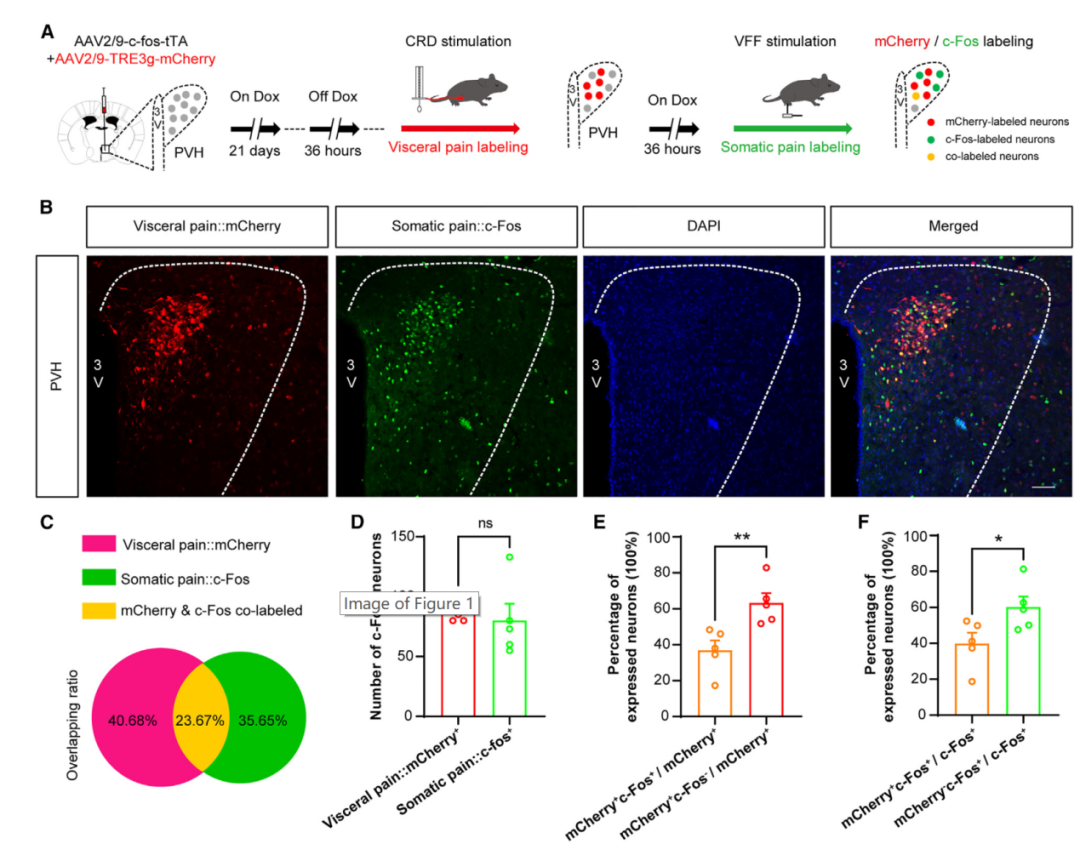 为了研究PVH在内脏痛和躯体痛中的反应,研究人员使用Tet-off病毒系统并结合c-Fos染色来研究PVH中由内脏痛和躯体痛激活的神经群体。通过结直肠扩张(CRD)构建小鼠的内脏痛模型,通过机械刺激(VFF)构建小鼠的躯体痛模型。对CRD和VFF分别激活的PVH神经元(表达mCherry的红色荧光神经元和c-Fos染色的绿色荧光神经元)进行分析,发现,大约40.68%的PVH神经群仅对内脏痛有反应,36.65%仅对躯体痛有反应,而23.67%对两者都有反应。提示PVH脑区存在不同的神经亚群,它们分别特异性处理内脏痛和躯体痛信号。