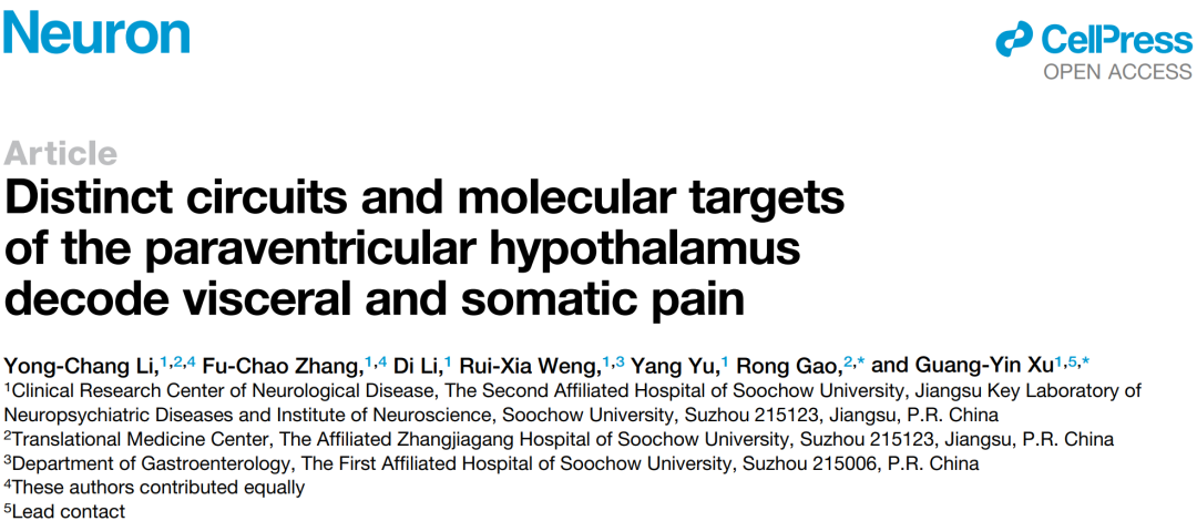 2024年9月25日,苏州大学徐广银教授团队在Neuron杂志发表题为“Distinct circuits and molecular targets of the paraventricular hypothalamus decode visceral and somatic pain”的研究论文,该研究提出下丘脑室旁核(PVH)作为“疼痛分拣中心”分别处理内脏痛和躯体痛信号。PVH中由内脏痛和躯体痛激活的神经元集群虽存在少量重叠,但主要呈现相互独立的特征,并分别投射至外侧隔核腹侧部分(LSV)和未定带尾侧部分(ZIC),专门介导内脏痛与躯体痛。此外,利用单细胞分辨率的fLCM-seq(功能依赖的激光显微切割捕获后RNA测序技术),发现P2X3R在内脏痛相关PVH神经元中特异性高表达,通过PVH-LSV环路调节内脏痛;而VIPR2则在躯体痛相关PVH神经元中特异性高表达,通过PVH-ZIC环路调节躯体痛。这些发现不仅深化了我们对大脑特异性处理内脏痛与躯体痛的神经回路及分子机制的认识,还为开发针对特定类型疼痛的靶向疗法提供了潜在的科学依据。