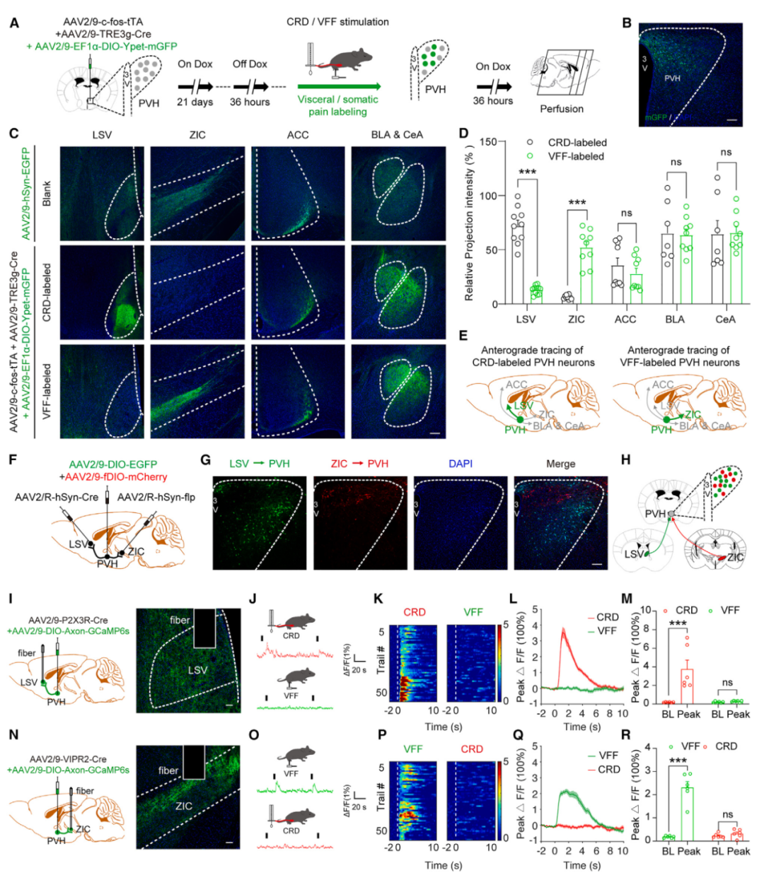 使用病毒示踪技术研究内脏痛和躯体痛激活的PVH投射的神经环路,发现内脏疼痛激活的PVH神经元特异性投射到LSV,但几乎不投射至ZIC;躯体痛激活PVH神经元特异性投射到ZIC,很少投射到LSV。作者进一步通过电生理结合光遗传学的实验,发现PVH-LSV和PVH-ZIC环路均为单突触谷氨酸能连接。通过对LSV和ZIC逆行标记的PVH神经元进行P2X3R和VIPR2的共定位,发现PVH-LSV投射神经元富集表达P2X3R,而PVH-ZIC投射神经元富集表达VIPR2。光纤钙成像系统记录到内脏疼痛刺激可显著引起表达P2X3R的PVH-LSV投射神经元活性升高;躯体疼痛刺激可显著引起表达VIPR2的PVH-ZIC投射神经元活性升高。这些结果表明PVHP2X3R+-LSV和PVHVIPR2+-ZIC神经环路具有独特的传递内脏和躯体疼痛信号的功能,从而特异性调节内脏疼痛和躯体疼痛。