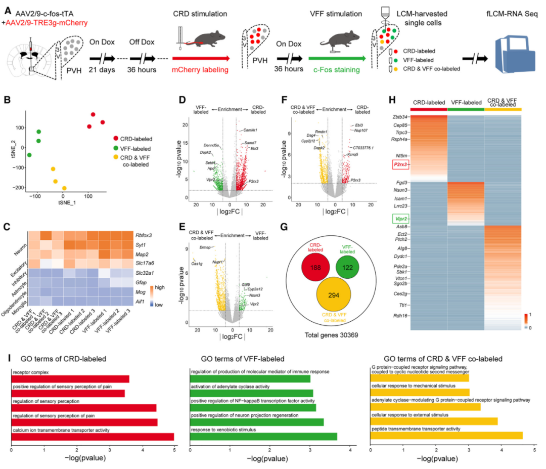 为了探究这些不同神经元亚群的分子特征,对内脏和躯体疼痛激活的PVH神经元进行测序,发现内脏和躯体疼痛激活的PVH神经元在转录水平上有显著差异,具体而言,P2rx3(嘌呤能P2X3受体)特异性富集表达在内脏痛激活的PVH神经元群中,Vipr2(血管活性肠肽受体2)特异性富集表达在躯体痛激活的PVH神经元群中。
