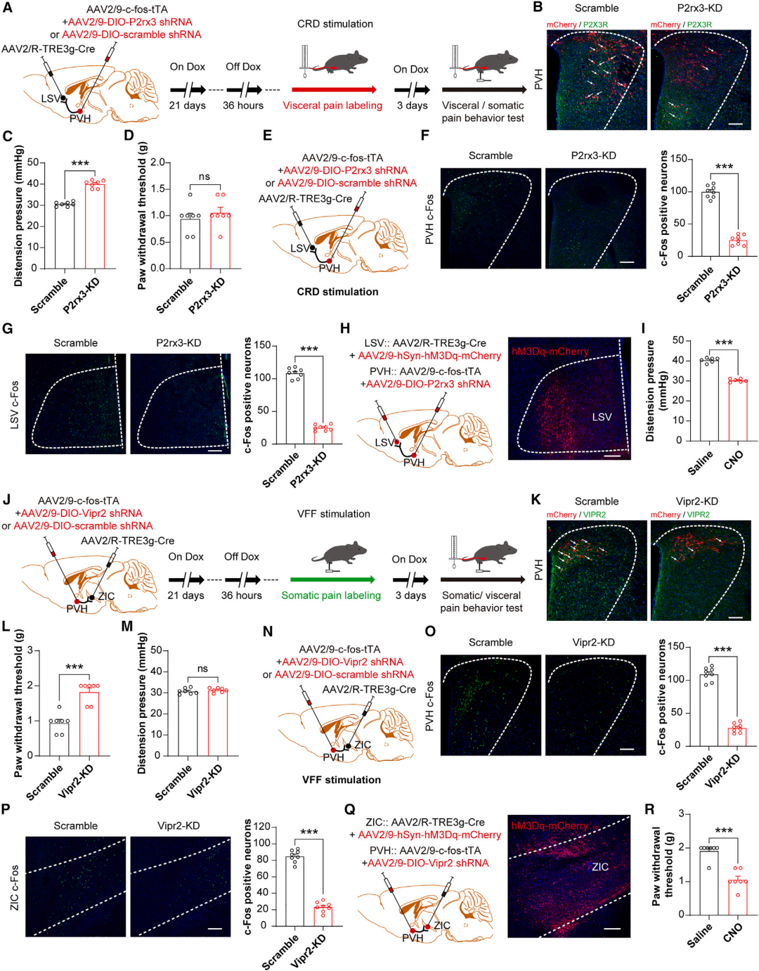 最后研究人员通过AAV介导的RNA干扰作用特异性敲低PVH神经元中的P2X3R和VIPR2表达,验证P2X3R和VIPR2在PVH-LSV和PVH-ZIC神经环路中的作用。结果显示特异性敲低PVH-LSV环路P2X3R表达后可显著降低CRD刺激PVH和LSV中c-Fos的表达,并显著增加内脏痛的疼痛阈值。敲低PVH-ZIC环路VIPR2表达后可显著降低VFF刺激PVH和ZIC中c-Fos的表达,并显著增加躯体痛的疼痛阈值。这些数据表明P2X3R通过PVHP2X3R+-LSV环路特异性调节内脏疼痛,而VIPR2通过PVHVIPR2+-ZIC环路特异性调节躯体疼痛。