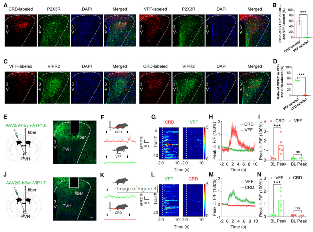 免疫荧光实验表明内脏痛激活的PVH神经元集群中表达P2X3R的比例为61.1%,表达VIPR2的比例仅为1.69%,躯体痛激活的PVH神经元集群中表达P2X3R的比例为1.09%,表达VIPR2的比例为53.58%。此外,研究人员在PVH脑区注射ATP或VIP(血管活性肠肽)的探针来研究ATP和VIP是否在内脏或躯体疼痛刺激下选择性释放。结果显示,表达ATP探针的PVH神经元对内脏疼痛刺激表现出强烈的反应,而对躯体疼痛刺激则没有这种反应;表达VIP探针的PVH神经元对躯体疼痛刺激反应显著,而对内脏疼痛刺激没有反应。综上所述,内脏和躯体疼痛刺激选择性地增加ATP和VIP释放,提示ATP-P2X3R和VIP-VIPR2通路是PVH分别介导内脏和躯体疼痛的潜在机制。