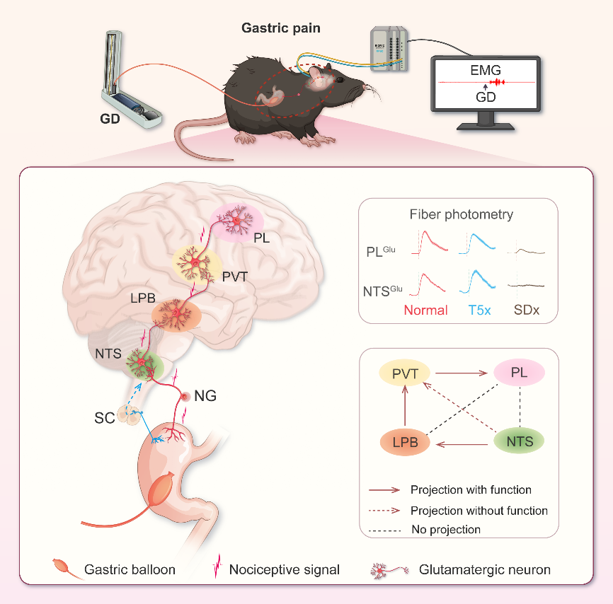 胃部疼痛作为一种高发消化道症状,其病因复杂、病程长、并发症多,治疗难度大,临床上多种疾病都与胃部疼痛感觉的发生密切相关,如功能性消化不良、胃溃疡、胃轻瘫和胃部肿瘤等。胃痛患者的食物摄入受损,导致体重下降和生活质量下降。传统上认为胃痛的发生与胃动力异常、内脏过敏和心身因素有关,但具体的发病机制尚不清楚,临床上也缺乏特异性的治疗方法。近年来,对内脏疼痛的研究取得了重大进展。然而,关于胃痛的研究主要集中在周围神经系统,对中枢神经系统机制的研究很少。临床迫切需要开发针对胃痛的新型、特异性治疗方法。早期的研究提供了与胃部具有结构连接脑核团的初步映射。然而,哪些核团可以响应胃痛刺激,以及中枢神经环路如何传递胃部疼痛信号尚不清楚。