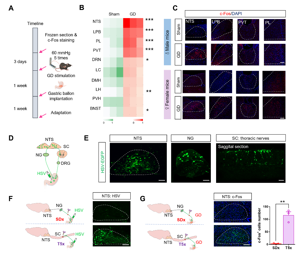 为探究参与胃痛的脑核团,在60 mmHg的有害GD后采用了全脑c-Fos染色。雌性与雄性小鼠NTS脑区、外侧臂旁核(LPB)、丘脑室旁核(PVT)和前边缘皮层(PL)是c-Fos表达水平最高的区域。NTS 是内脏感觉传导的重要枢纽,但其对胃痛信号传导的影响仍不确定。因此,我们向胃壁注射了表达增强型绿色荧光蛋白(HSV-EGFP)的1型单纯疱疹病毒(HSV-1)。在迷走神经节状神经节(NG)和脊髓(SC)都观察到了 EGFP 阳性神经元表达。HSV 表达最高的区域包括 NTS、LPB、PVT、PL等脑区。为研究 NTS 胃源信号主要通过迷走神经还是脊神经传导,对小鼠进行了膈下迷走神经切断术(SDx)或T5脊髓横断术(T5x)。结果显示NTS通过迷走神经对胃痛刺激做出反应,为确定胃痛信号的上升通路奠定了基础(图1)。