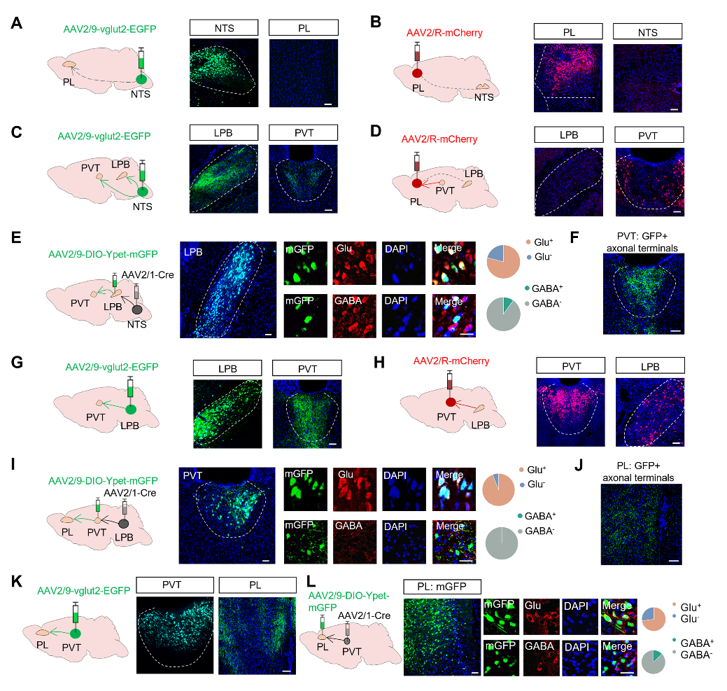 基于HSV表达和c-Fos染色结果,研究人员首先鉴定从NTS到PL是直接投射还是间接投射。通过顺行、逆行病毒标记,显示NTS与PL并无直接投射关系。通过不同的病毒组合策略(顺行病毒标记、逆行病毒标记、顺行跨单突触病毒标记、突触末梢增强的病毒标记等),鉴定出一条谷氨酸能的四级神经环路 NTS-LPB-PVT-PL(图2)。