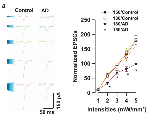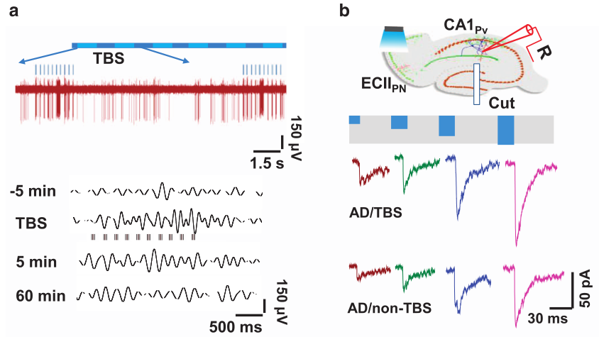 临床上认为深部脑刺激有可能成为治疗AD的希望。研究人员用光在ECIIPN诱发θ脉冲刺激(TBS),自由活动的AD小鼠CA1亚区中,电生理可以记录到一个明显θ震荡。离体脑片记录发现经过TBS治疗的AD小鼠CA1的PV神经元EPSC的幅度明显增加。微小兴奋性突触后电流记录也发现TBS治疗的AD小鼠CA1的PV神经元mEPSC的频率和幅度均得到明显的恢复。