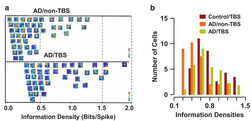 在行为学的测试中,研究人员首先检测了在小鼠自由移动过程中位置细胞的放电情况。电生理记录发现在经过TBS治疗35天后的AD小鼠处理空间位置信息的能力显著增加。说明TBS治疗能显著增加AD小鼠的空间记忆能力。