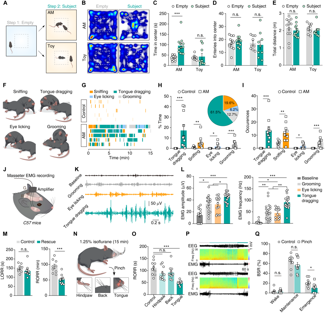 首先,作者发现旁观者小鼠(Bystander)对麻醉小鼠而不是玩具小鼠表现出更大的兴趣,随后精细分析了旁观者小鼠对麻醉小鼠的行为表型,主要包括嗅探、理毛、舔舐眼睛、拖拽舌头。其中,拖拽舌头相较于其它行为发生次数和持续时间最长,并发现这种行为不同于简单的面部舔舐行为。考虑到麻醉小鼠在被拖拽舌头时躯体和四肢发生明显的抖动和震颤,作者猜测这种行为可能与促进麻醉苏醒相关。随后的翻正反射测试和脑电记录也证明了这一点,即旁观者小鼠这种类似救助的“拖拽舌头”行为可以促进麻醉后小鼠的快速苏醒。