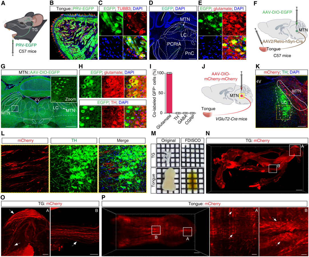 为了探究舌头的痛觉刺激如何影响麻醉苏醒,作者随后通过病毒示踪、组织透明化和免疫荧光染色,对“舌头-大脑”之间的神经连接进行解析。发现MTNGlu可以直接投射到舌头,同时在毗邻的LC也存在投射纤维,猜测“拖拽舌头”行为可能经由此通路调节LC脑区活性,从而介导麻醉后的快速苏醒。