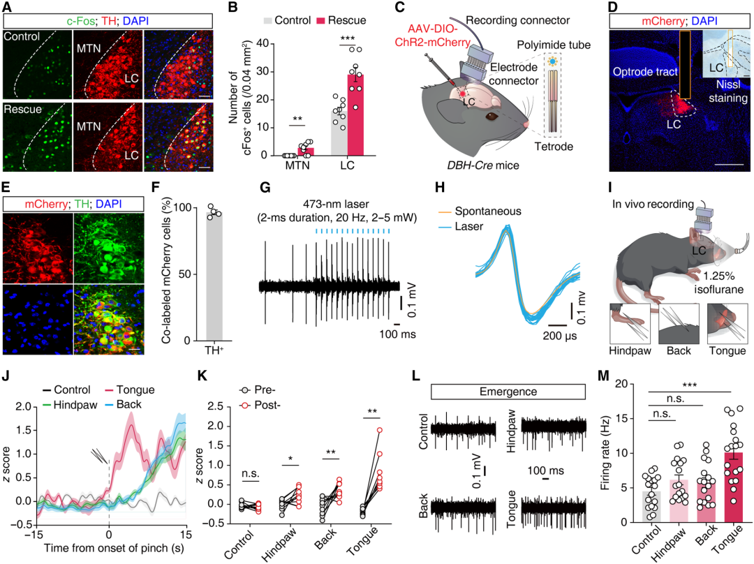通过免疫荧光染色,作者发现“拖拽舌头”行为的确会导致MTN和LC脑区的激活。随后人为模拟这一行为,发现同等强度疼痛刺激下,刺激舌头要比背部或足底诱导更加快速和强烈的LCNE神经元活性升高。