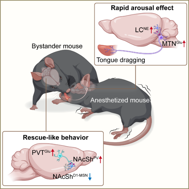 2025年1月22日,中国科学技术大学/安徽医科大学张智教授团队、安徽医科大学基础医学院陶文娟教授和第一附属医院疼痛科王立奎主任医师团队联合在Science Advances杂志上发表了题为“Rescue-like behavior in a bystander mouse towards anesthetized conspecifics promotes arousal via a tongue-brain connection”的研究成果。该研究以小鼠为模型,发现旁观者小鼠会对麻醉同伴做出拖拽舌头行为,并发现这种舌头上的痛觉刺激能够通过直接的舌-脑神经通路(舌头→三叉神经中脑核谷氨酸能神经元(MTNGlu)→蓝斑核去甲肾上.腺素能神经元(LCNE))促进麻醉小鼠的苏醒。此外,该研究还发现丘脑室旁核(PVT)投射到伏隔核壳(NAcSh)的神经环路能够调控旁观者小鼠的这类特殊拖拽舌头行为。