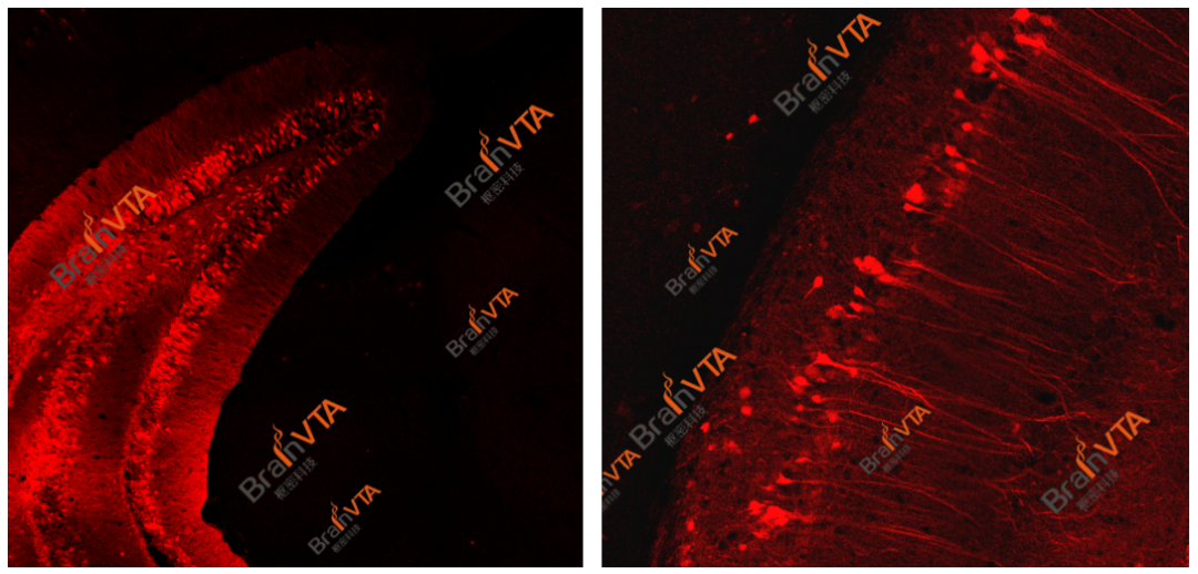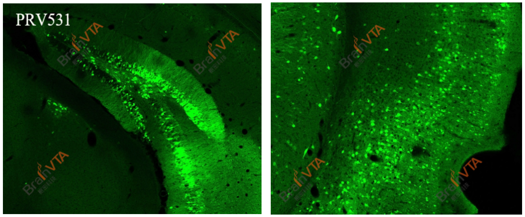 我司提供的PRV Bartha株可建立逆向示踪工具系统,用于解析特定和非特定脑区的上游输入网络,以及外周运动系统与中枢神经环路之间的关系。升级版高亮度逆向跨多级PRV测试效果如下: