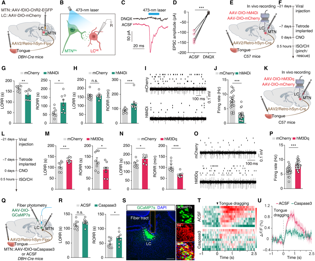 图4. 舌-MTNGlu-LCNE神经通路介导“舌头拖拽”行为促进麻醉苏醒