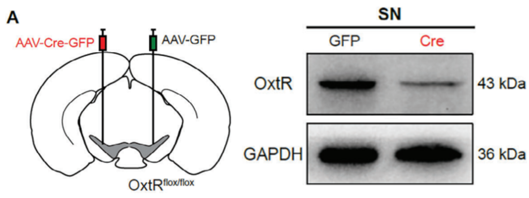 研究人员在转基因小鼠Oxtrflox/flox[催产素受体(OxtR)基因的特定外显子两侧被插入了同向的LoxP位点]一侧SN注射病毒AAV-Cre-GFP,另一侧SN注射对照病毒AAV-GFP,通过Cre-LoxP系统实现单侧SN特异性敲除Oxtr的目的。在病毒注射后30天,通过蛋白质免疫印迹实验验证了敲除效率。