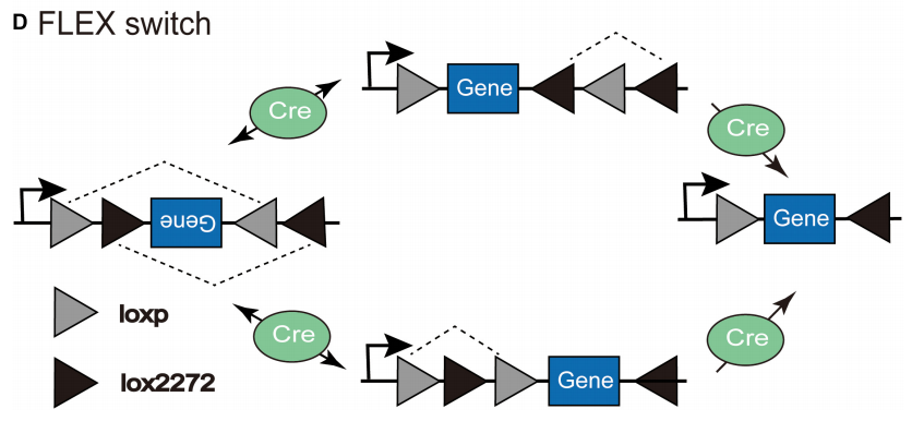FLEX(Flip-Excision)系统或称为翻转-切除系统,该系统通过在目标基因两侧设计两对不同方向或类型的LoxP位点,使得Cre重组酶介导的两次连续重组事件可先翻转基因片段方向再切除特定序列。相较于传统Cre-LoxP的单次重组功能,FLEX系统通过巧妙的位点排列实现了基因表达的双向调控。
