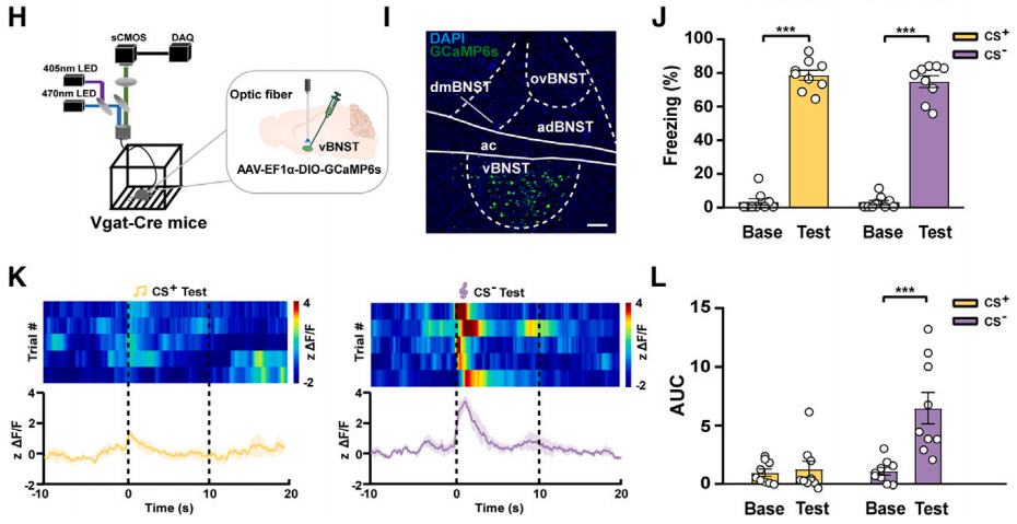 研究人员将AAV-DIO-GCaMp6s注射到Vgat-Cre小鼠(Vgat神经元中特异性表达Cre的小鼠)的vBNST脑区,借助DIO系统(Cre-on)在vBNST中的Vgat神经元中特异性表达钙离子指示剂GCaMp6s,从而检测钙离子波动。结果表明,在不可预测威胁(CS-)实验中,vBNST中Vgat神经元的Ca2+信号显著升高,而在可预测威胁(CS+)实验中则没有。