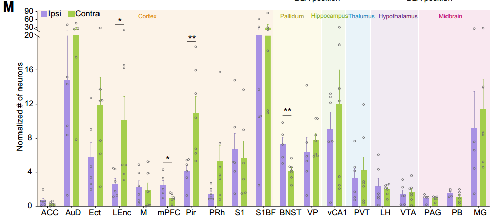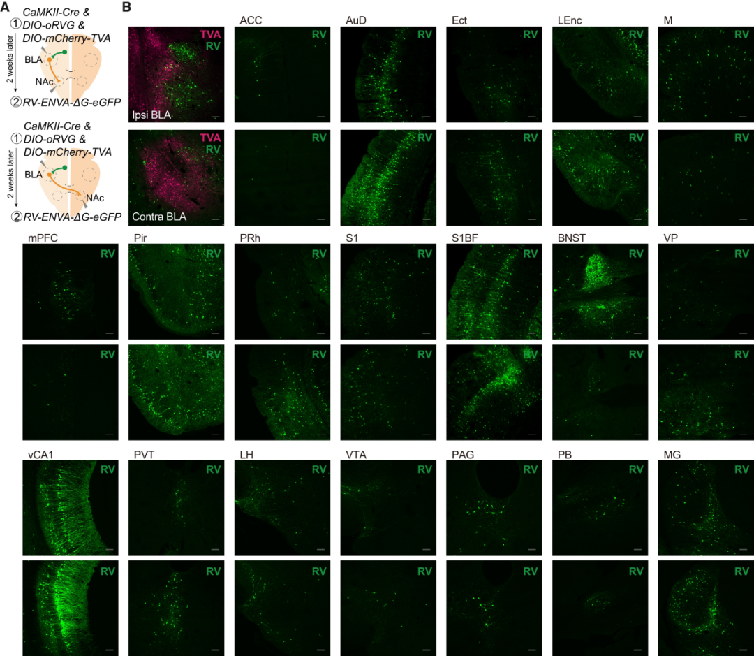 研究人员将病毒AAV-EF1a-DIO-mCherry-F2A-TVA、AAV-EF1a-DIO-RVG和兴奋性神经元启动子CaMKIIa驱动的AAV-CaMKIIa-Cre混合单侧注射到BLA中。两周后,将RV-ENVA-ΔG-eGFP注射到同侧或对侧NAc中。基于DIO系统(Cre-on)的狂犬病毒逆行跨单突触示踪显示,投射至同侧NAc的BLA神经元主要接收来自BNST和mPFC的输入,而投射至对侧NAc的BLA神经元则主要接收来自LEnc和Pir的输入。