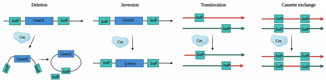 当基因中存在LoxP位点且有Cre重组酶存在时,Cre重组酶会特异性识别LoxP位点两端的反向重复序列,并与之结合形成二聚体。此二聚体与其他LoxP位点的二聚体结合,进而形成四聚体。随后,LoxP位点之间的DNA序列被Cre重组酶切割,产生DNA断裂。最终,断裂的DNA末端通过DNA连接酶的作用重新连接,完成重组过程。根据LoxP位点的方向和位置,Cre酶可以介导以下几种基因操作: