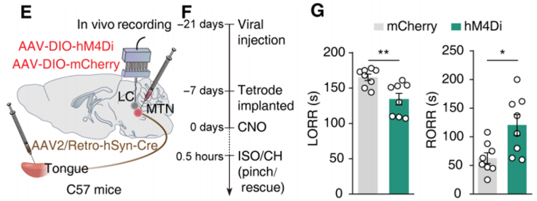 研究人员将逆行病毒AAV2/Retro-hSyn-Cre注入到C57小鼠舌头中,并将Cre依赖性病毒AAV-DIO-hM4D(Gi)-mCherry注射到小鼠双侧MTN脑区,借助DIO系统(Cre-on)特异性在舌投射的MTN神经元中表达化学遗传抑制受体hM4D(Gi)。实验结果表明,与表达mCherry的对照组相比,化学遗传学抑制舌投射的MTN神经元显著降低了麻醉小鼠的翻正反射消失(LORR)时间,同时显著增加了翻正反射恢复(RORR)时间。