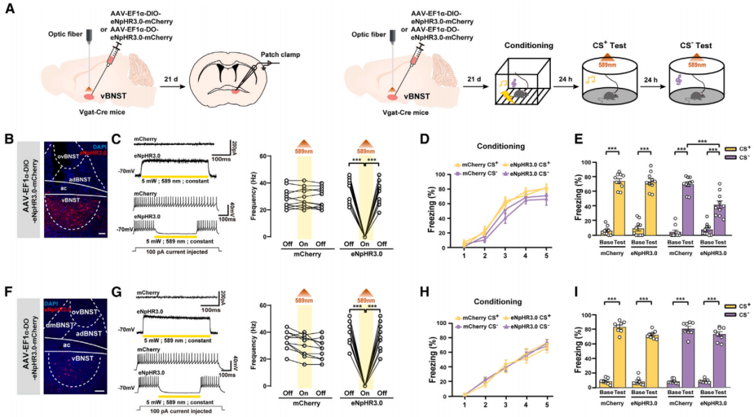 研究人员将AAV-EF1a-DIO-eNpHR3.0-EYFP或AAV-EF1a-DO-eNpHR3.0-EYFP注射到Vgat-Cre小鼠的vBNST中,借助DIO系统(Cre-on)或DO系统(Cre-off)分别在GABA能神经元或非GABA能神经元中表达光抑制型光敏蛋白eNpHR3.0。结果表明,光遗传学抑制vBNST中的GABA能神经元,小鼠响应CS-的僵直行为减少,而响应CS+的僵直行为无明显差异;抑制vBNST中的非GABA能神经元对小鼠在CS+或CS-条件下的响应均没有影响。