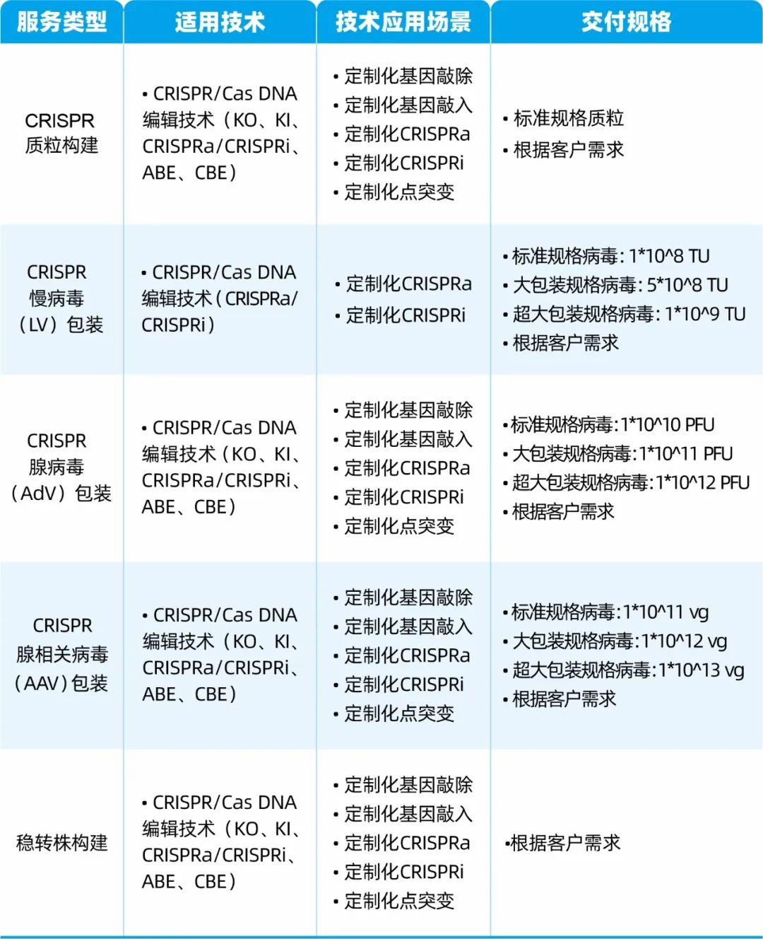 目前,枢密科技已开发CRISPR/Cas DNA编辑系列病毒载体,提供现货产品、定制病毒包装及细胞系构建服务,相关内容如下: