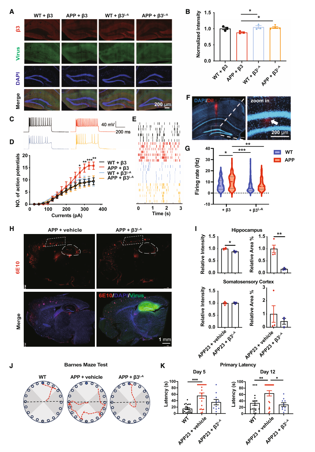为进一步探讨神经元异常兴奋性病理意义,研究团队构建了无法被剪切的突变体亚型GABAAR β3L-A。利用rAAV(重组腺相关病毒)在APP23小鼠海马中表达GABAAR β3亚基及其突变体,研究团队发现GABAAR β3L-A突变体能够明显改善APP23小鼠颗粒细胞的过度兴奋,减少Aβ沉积,并改善小鼠的空间记忆障碍(图4)。这表明,通过靶向调节BACE1对GABAAR β亚基的剪切,能够抑制神经元异常兴奋,并有助于延缓AD的病理进展。