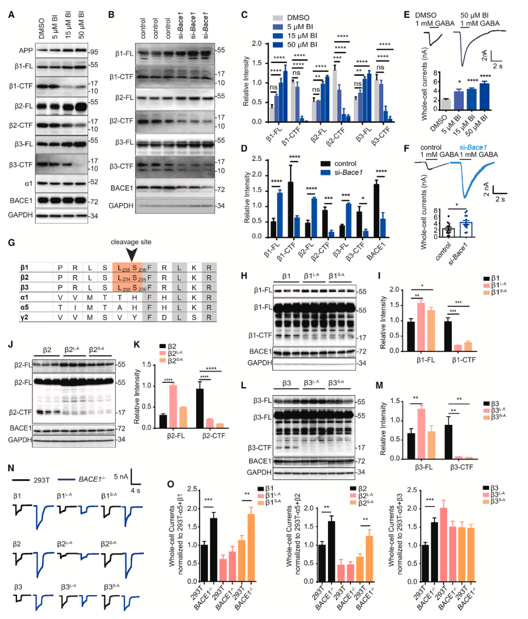 与此同时,研究团队发现,GABAAR β1/2/3亚基的减少可能是导致脑内抑制性电流功能损伤的机制。并且在AD病人以及APP23动物脑内均观察到了GABAAR β1/2/3亚基的片段,提示了其减少可能是因为异常的蛋白酶切割导致(图2)。进一步,研究团队通过蛋白质质谱、切割位点突变等手段,鉴定了切割APP的关键蛋白酶BACE1是切割GABAAR β亚基的蛋白酶(图3)。AD病人脑内的BACE1上调,导致GABAAR β亚基的过度切割,损伤了抑制性电流及其功能。这一工作也首次证实了BACE1在调控神经元的兴奋性中的直接作用。