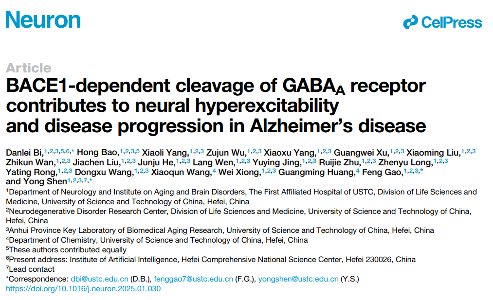 近期,中国科学技术大学神经退行性疾病研究中心申勇教授团队在Neuron上发表了题为“BACE1-dependent cleavage of GABAA receptor contributes to neural hyperexcitability and disease progression in Alzheimer's disease”的文章。该研究证明了AD病理的关键蛋白酶——β-分泌酶(BACE1)剪切GABAA受体(GABAAR)β亚基驱动了AD脑内神经元过度兴奋及疾病进展。