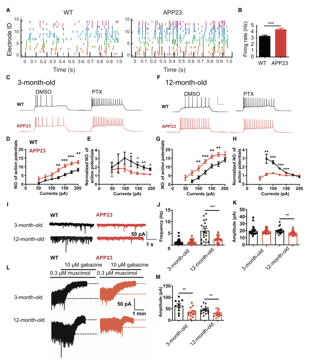 为研究AD神经元过度兴奋的病理机制,研究团队采用了APP23转基因小鼠模型,该模型通过过表达携带瑞典突变的APP(淀粉样前体蛋白)基因,能够模拟AD患者的淀粉样斑块的病理特征。研究显示,在淀粉样斑块出现之前(3月龄),APP23小鼠海马齿状回颗粒细胞已经表现出显著的过度兴奋,并证明了其与GABAAR介导的抑制性电流减少密切相关。神经元的过度兴奋在12月龄(斑块出现后)的AD小鼠颗粒细胞中仍然持续存在。这和在AD病人脑内观察到的现象一致,说明神经元异常兴奋性在AD发生的早期已经存在(图1)。