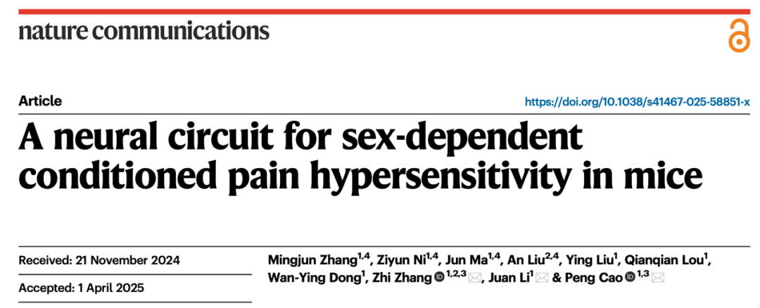 2025年4月17日,中国科学技术大学生命科学与医学部张智教授/曹鹏副研究员、中国科学技术大学第一附属医院李娟主任医师团队在Nature Communications杂志发表题为“A neural circuit for sex-dependent conditioned pain hypersensitivity in mice”的研究文章。本文综合以往研究进展,发现了一种雄性特异的情境痛敏现象,即当再次暴露于疼痛相关情境后,雄性痛觉阈值显著降低,但雌性不变,并揭示了该模型下疼痛机制性别差异的潜在神经机制。