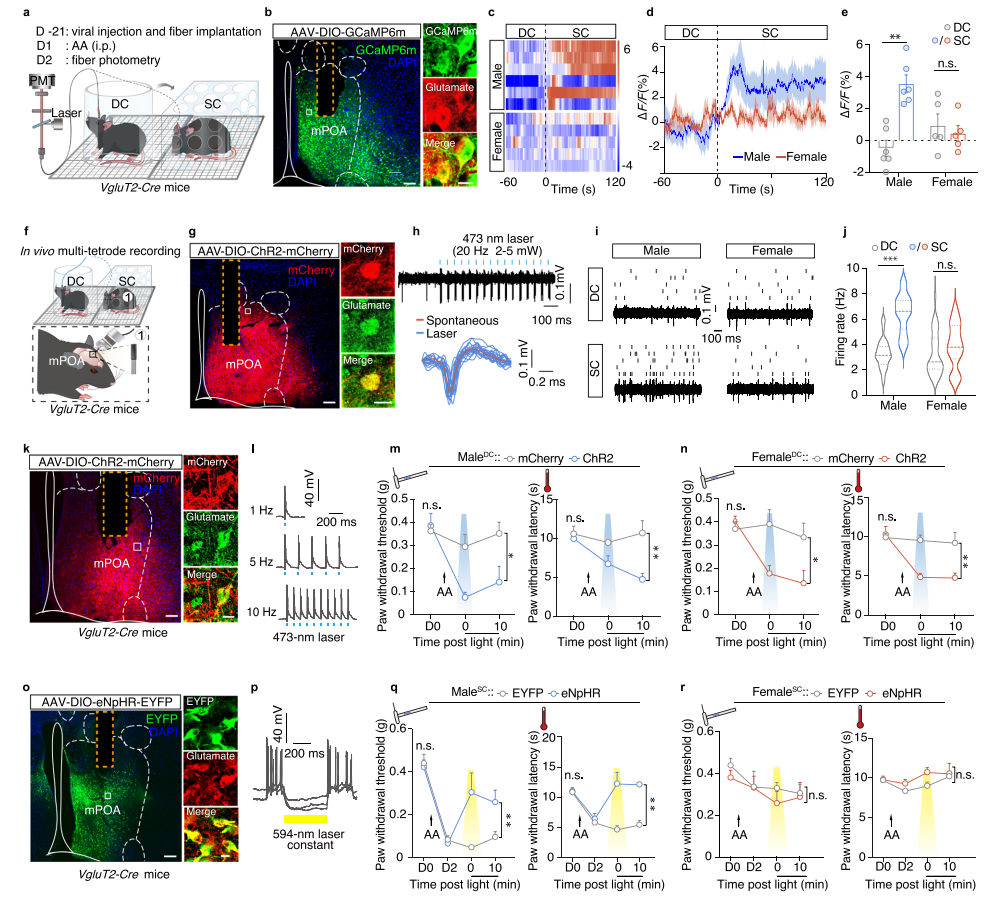 通过对情境痛敏模型下雌雄小鼠全脑多个相关脑区进行c-Fos检测,研究人员发现下丘脑内侧视前区的谷氨酸能神经元(GlumPOA)在相同情境下被激活的雌雄差异性程度最大。随后在自由移动的小鼠中通过在体光纤和在体多通道电极记录发现,当其从不同情境进入相同情境中后,雄鼠GlumPOA神经元被显著激活,而雌鼠不激活。此外,人为激活这群神经元能够在雌雄小鼠中均诱导出情境痛敏行为,而抑制模型下的该群神经元的活性能缓解雄鼠的情境痛敏行为。
