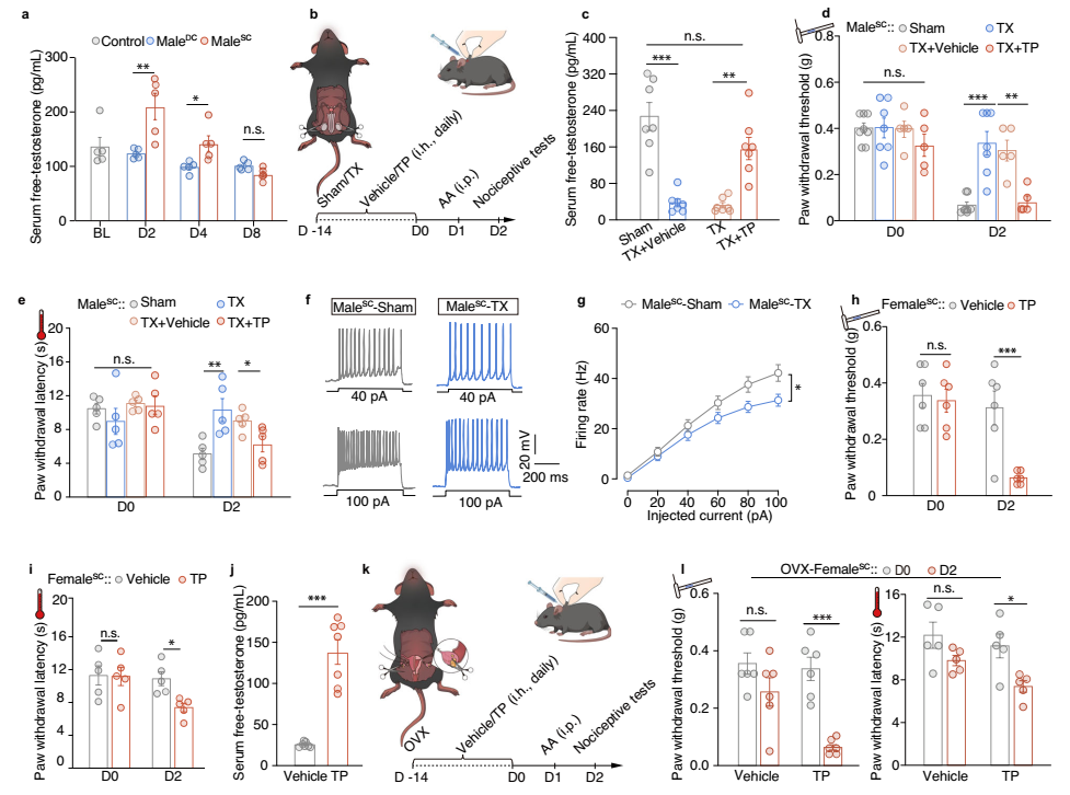 图3. 疼痛情境下雄鼠游离睾酮水平升高导致雄性特异的情境痛敏