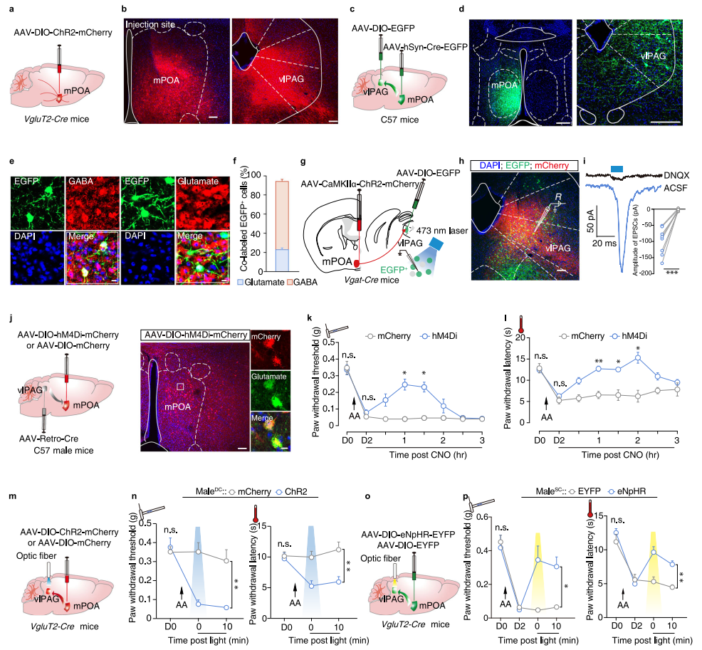 mPOA脑区并不属于经典的痛觉相关核团。为了探究GlumPOA神经元在雌雄小鼠中参与疼痛发生的原因,作者接下来寻找了GlumPOA神经元所支配的下游大脑区域,并检测其是否存在和疼痛相关核团的连接。在全脑检测mPOA脑区顺行投射而来的mCherry阳性信号,结果显示,腹外侧中脑导水管周围灰质(vlPAG)中存在大量的mCherry阳性神经纤维,vlPAG脑区在疼痛下行通路中发挥重要作用。而相比之下在其它经典的疼痛信息加工处理脑区,如前扣带回皮层(ACC)和初级体感皮层(S1)中,mCherry阳性信号表达很少。进一步通过光遗传学或化学遗传学调控实验证明,雄鼠GlumPOA神经元通过激活其下游的GABAvlPAG神经元(vlPAG中GABA能神经元)导致情境痛敏行为的产生。