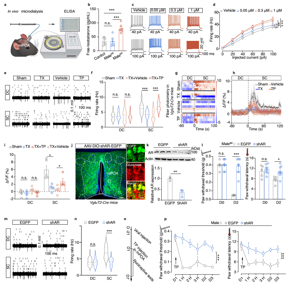 通过在体微透析联合酶联免疫吸附以及膜片钳电生理记录技术,研究人员发现升高的游离睾酮能够激活GlumPOA神经元。在体记录结果显示,去势雄鼠在进入相同情境后GlumPOA神经元不再激活,而对于雄激素补偿的去势雄鼠,该神经元在相同情境下的激活又会重新出现。使用病毒RNA干扰策略,敲低GlumPOA神经元上雄激素受体的表达,同样发现雄鼠不再表现出情境痛敏行为,且疼痛情境下GlumPOA神经元活性也不再升高。