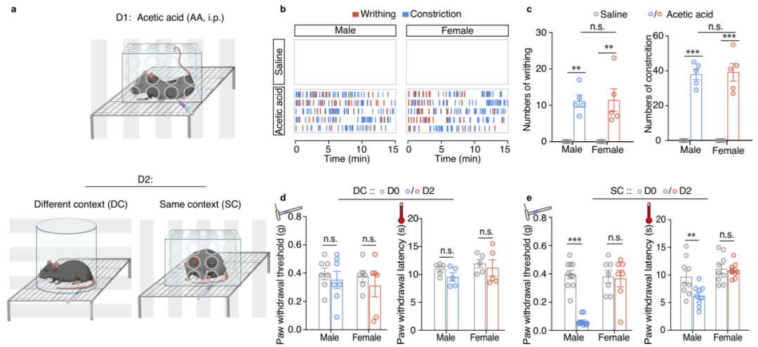 研究人员第一天在雌雄小鼠腹腔注射低浓度乙酸诱导急性内脏痛,期间匹配特定情境,发现乙酸在小鼠中诱导的疼痛程度无性别差异。待小鼠从疼痛中恢复后将其放回笼盒,第二天将小鼠放置在与疼痛情境相同或不同的环境中,并检测其痛觉阈值,发现雄性小鼠痛阈显著降低,而雌性小鼠无变化。