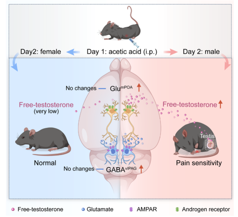 mPOA脑区是经典的性别二态核团,分布了大量的性激素受体,能够响应机体性激素水平变化。性激素水平在两性之间大不相同,影响着性别二态的疼痛感知。睾酮作为主要的雄激素,能够调节机体疼痛感知和疼痛恢复的进程,游离睾酮是一种具有生物活性的未结合睾酮成分,能够与雄激素受体结合来调节性别二态行为。研究人员发现,疼痛情境下雄鼠血清中游离睾酮水平显著升高,随后,对雄鼠进行去势或雄激素补偿,发现去势雄鼠不再出现情境痛敏行为,而雄激素补偿能够使其重新出现情境痛敏行为。此外,在雌鼠中慢性补偿雄激素也能使其诱导出情境痛敏行为,且不改变其基础痛阈。