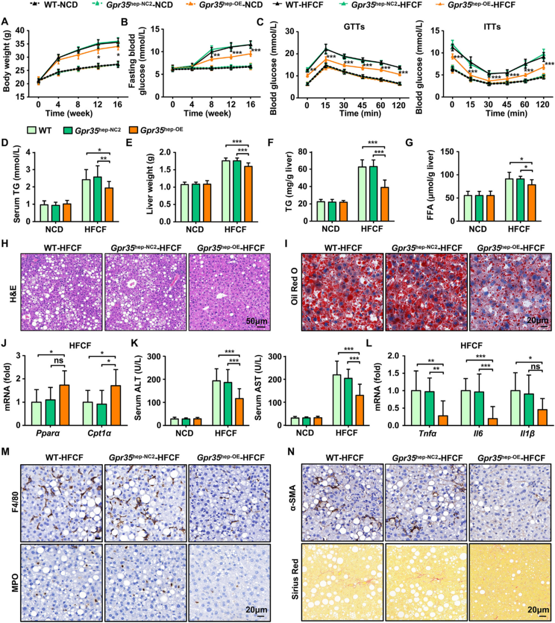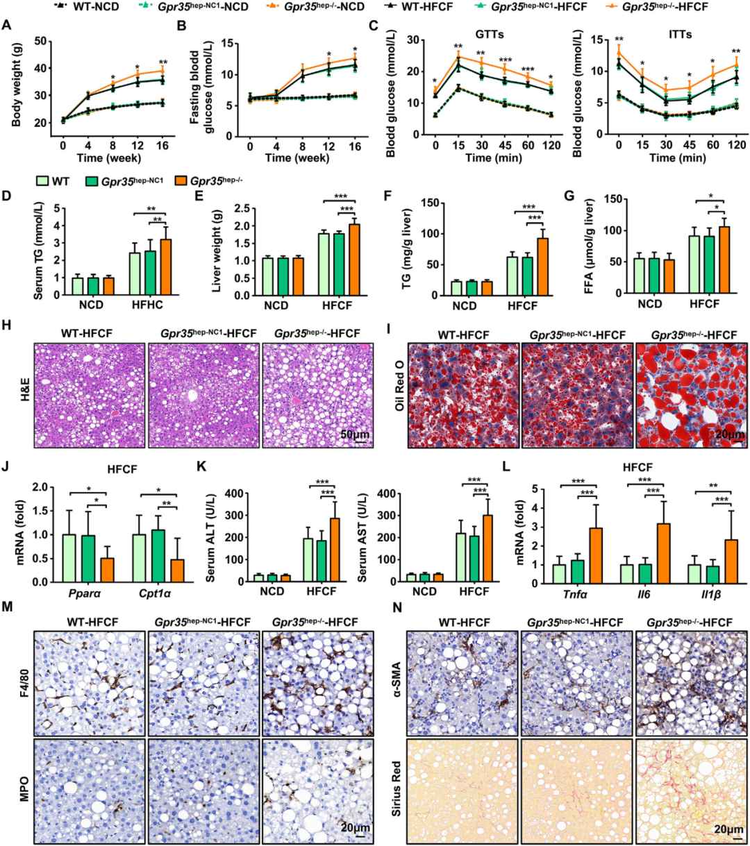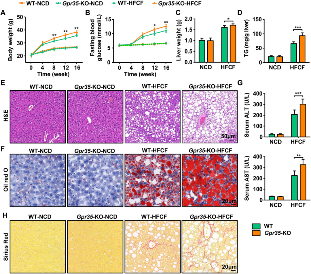 图2.全身性敲除GPR35加剧了HFCF饮食诱导的脂肪性肝炎